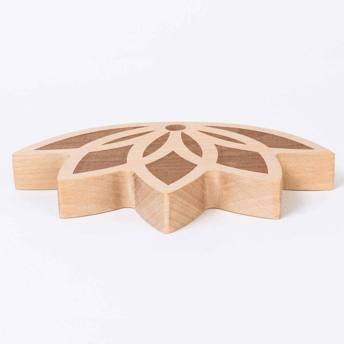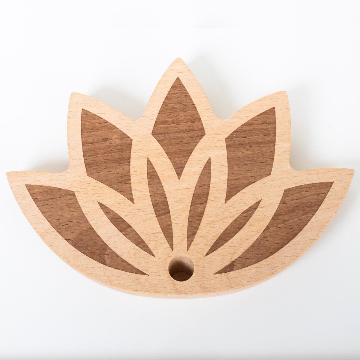 Le support pour carillon Fleur de lotus convient à un carillon Koshi ou Zaphir et peut être assemblé rapidement et facilement. La tige en bois s'insère simplement dans la plaque de base et le carillon est suspendu au sommet.